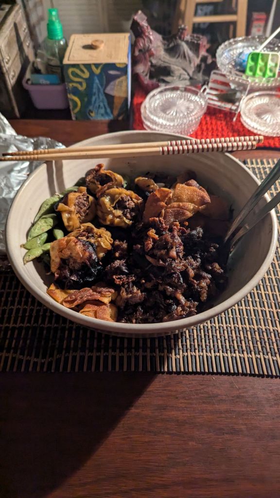 Elk Hot Mustard Tartare Shumai + Shredded Burnt End Candied Ribs with Caramelized Onion Relish; and Microwaved Edamame.